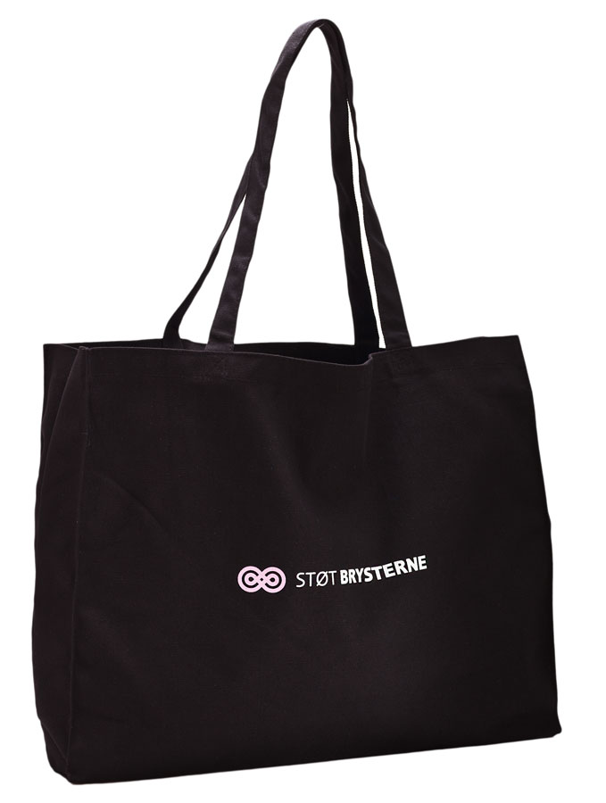 Sort mulepose med logo tryk. Posen er lavet i kanvas i 300 g/m2, hvilket er et kraftigere og grovere materiale end bomuld.