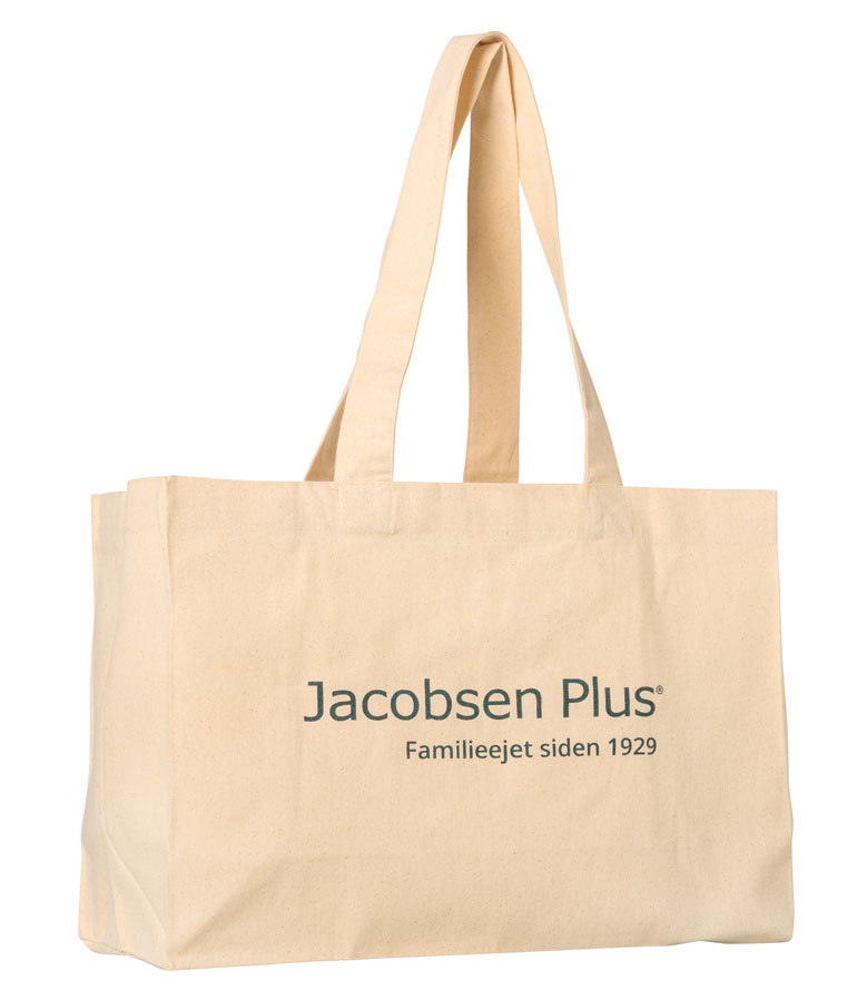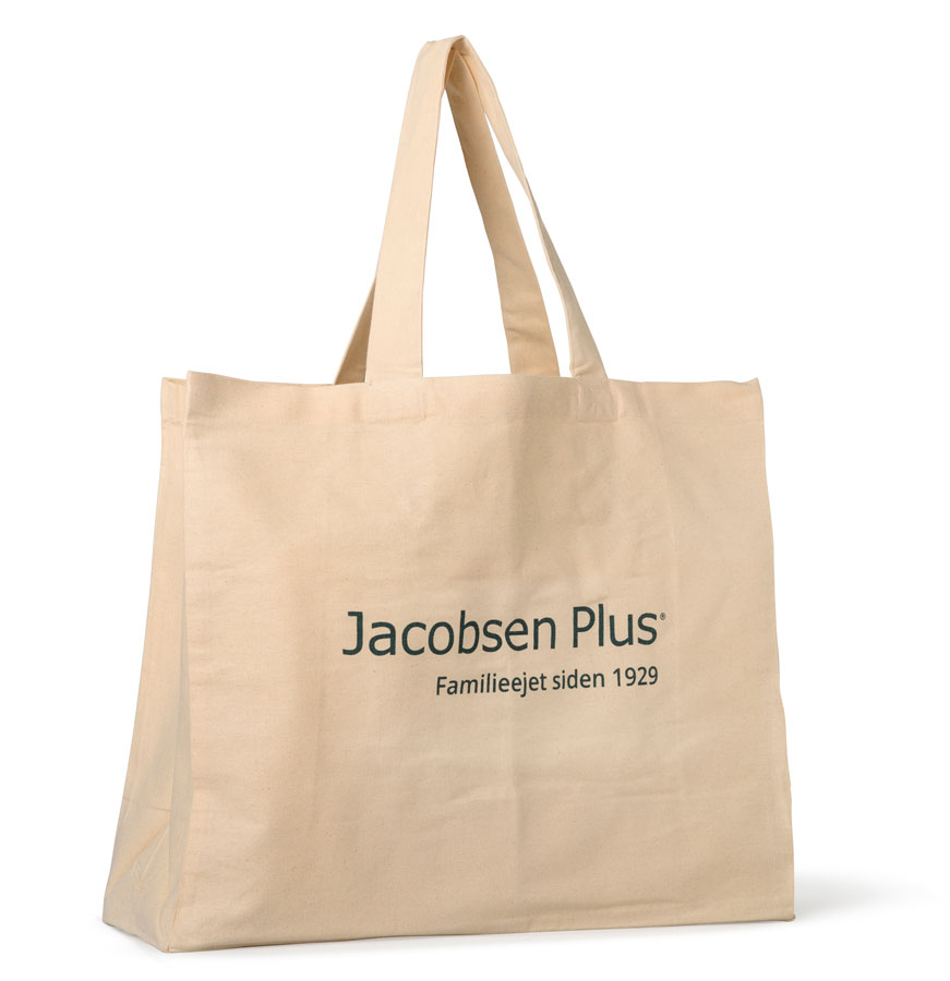 Naturfarvet mulepose med et stilrent design. Posen er lavet til Jacobsen Plus og deres forretninger.