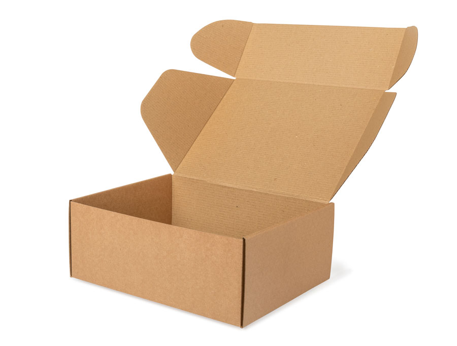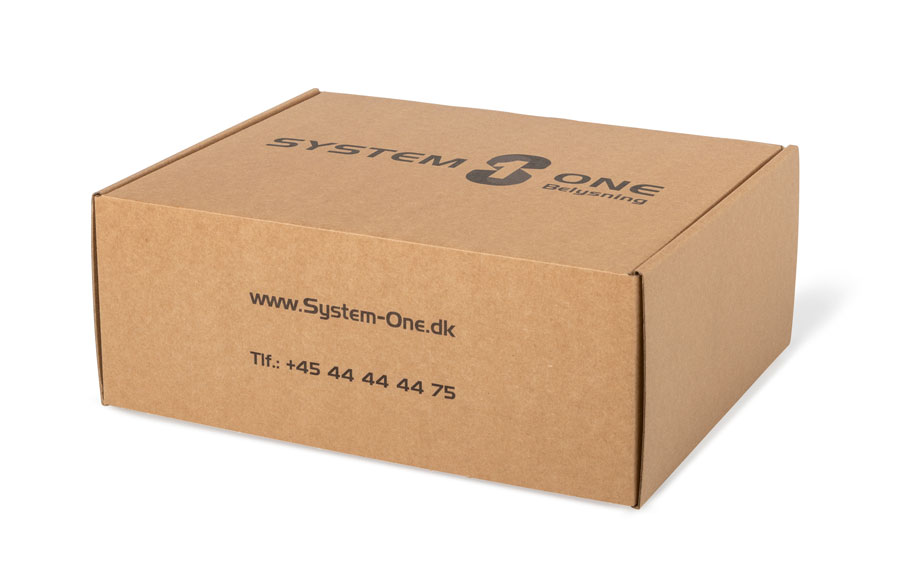Forsendelsesæske med låg i brunt kraftpapir. Papkassen kan tilpasses i målene til et specifikt produkt og kan bruges til forsendelse eller til pakning i eksportkartoner.
