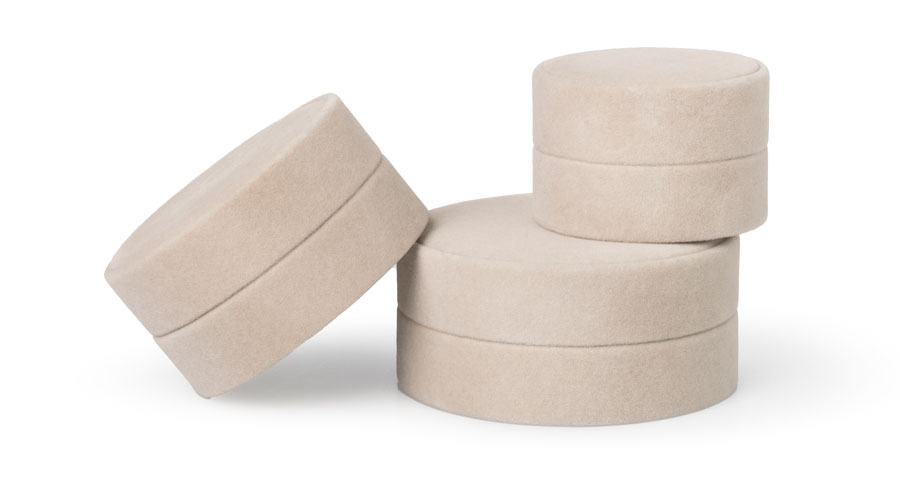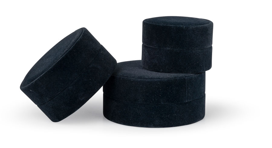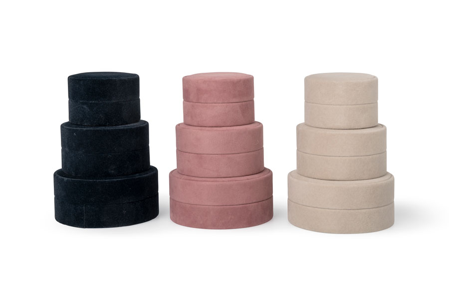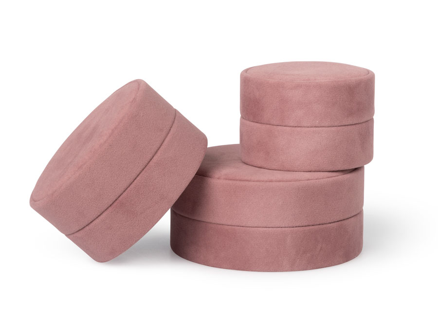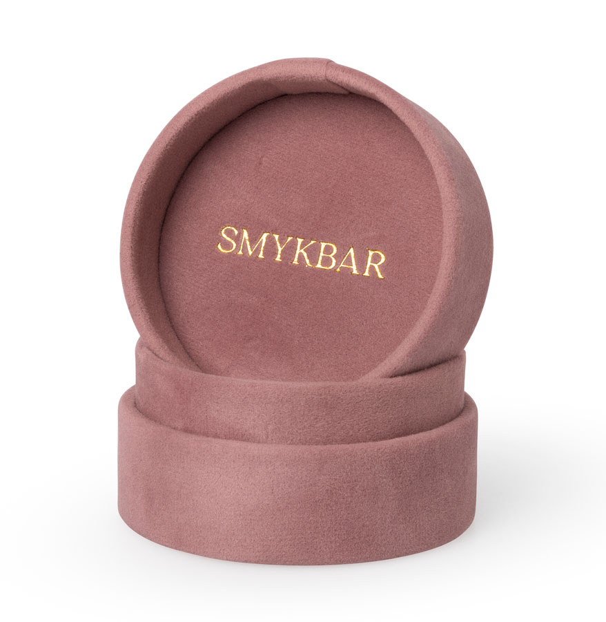Flot og eksklusivt rund æske. Æsken er lavet i velour og med flot guld folietryk inden i låget.