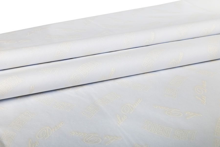Silkepapir i hvid med hvidt tryk på. Silkepapir er en flot og stilfuld tilføjelse til jeres nuværende emballage og sikrer god eksponering af jeres brand.